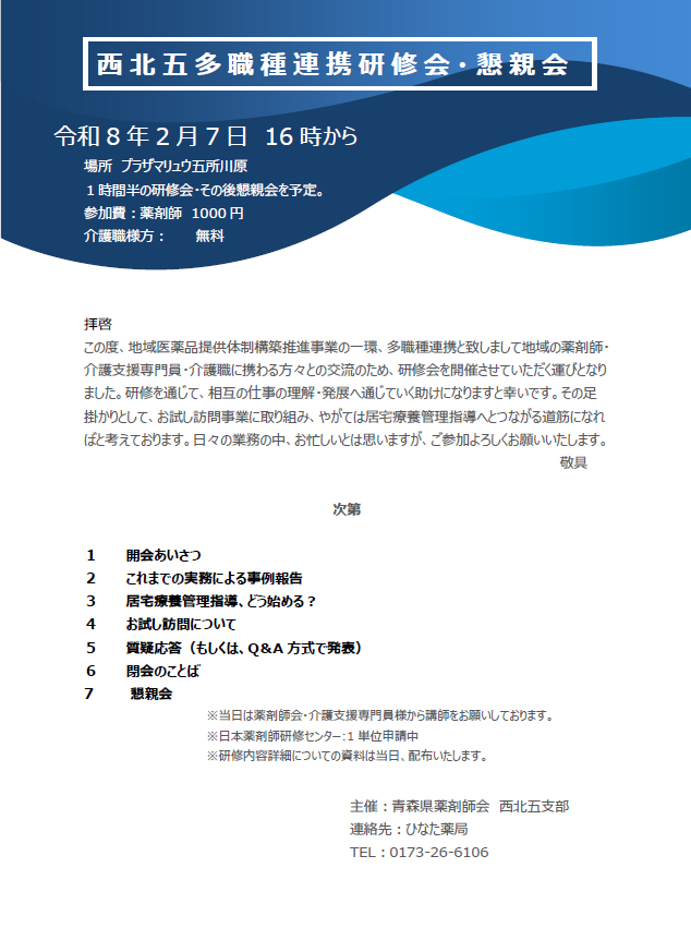 西北五薬剤師会主催の研修会ならびに懇親会のお知らせです。