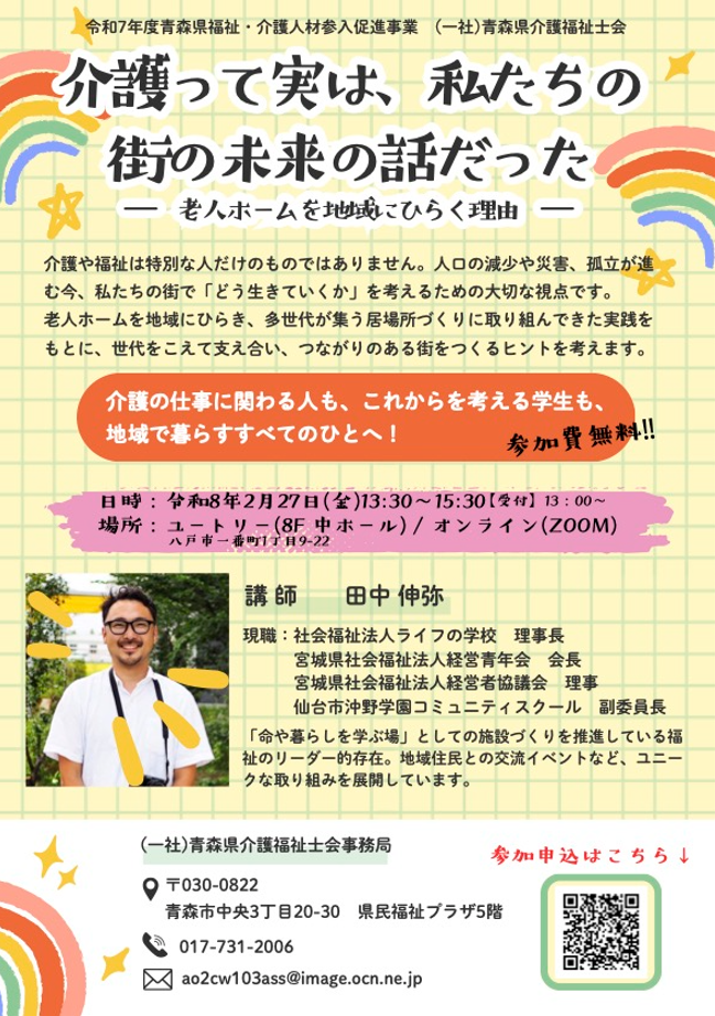 【青森県介護福祉士会よりお知らせ】研修会のご案内「介護って実は、私たちの街の未来の話だったー老人ホームを地域にひらく理由ー」