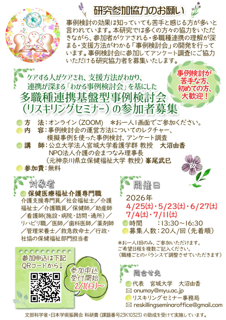 【宮城大学看護学群 大沼由香研究室よりお知らせ】多職種連携基盤型事例検討会(リスキリングセミナー)参加者募集のご案内